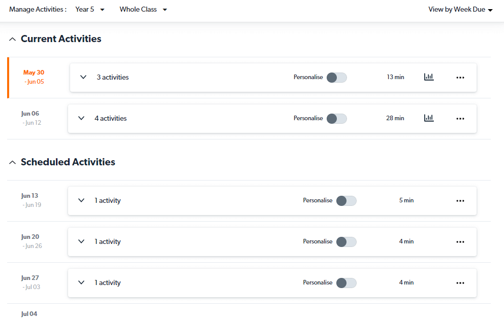 Abrir uma semana permite visualizar todas as atividades atribuídas para aquela semana, com mais opções para personalizar a ordem em que seus alunos verão as atividades e editar as datas de uma atividade individual: