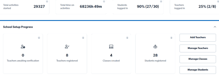 O painel oferece uma visão holística do envolvimento da sua escola com a Matific. Você pode acessar facilmente os dados como: o número total de atividades iniciadas, o tempo gasto em tarefas e o número de logins de alunos e professores. Simplifique o gerenciamento da Matific em toda a sua escola, reduzindo a sobrecarga administrativa.