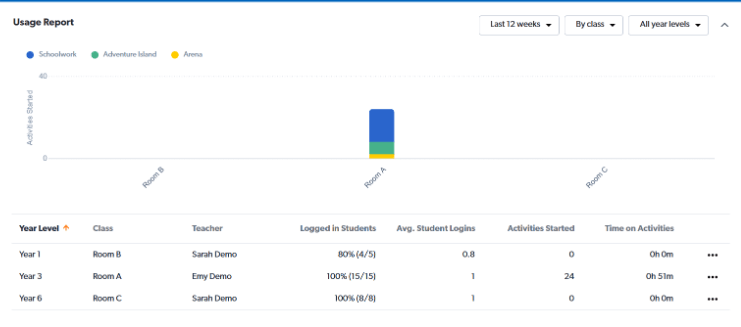Se aprofunde nos relatórios de uso por classe ou série de sua escola. Esse recurso permite que os administradores entendam onde os alunos estão mais engajados, ajudando no planejamento do currículo e na alocação de recursos.