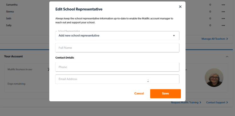 - Você pode alterar o representante da sua escola ou as informações deles.